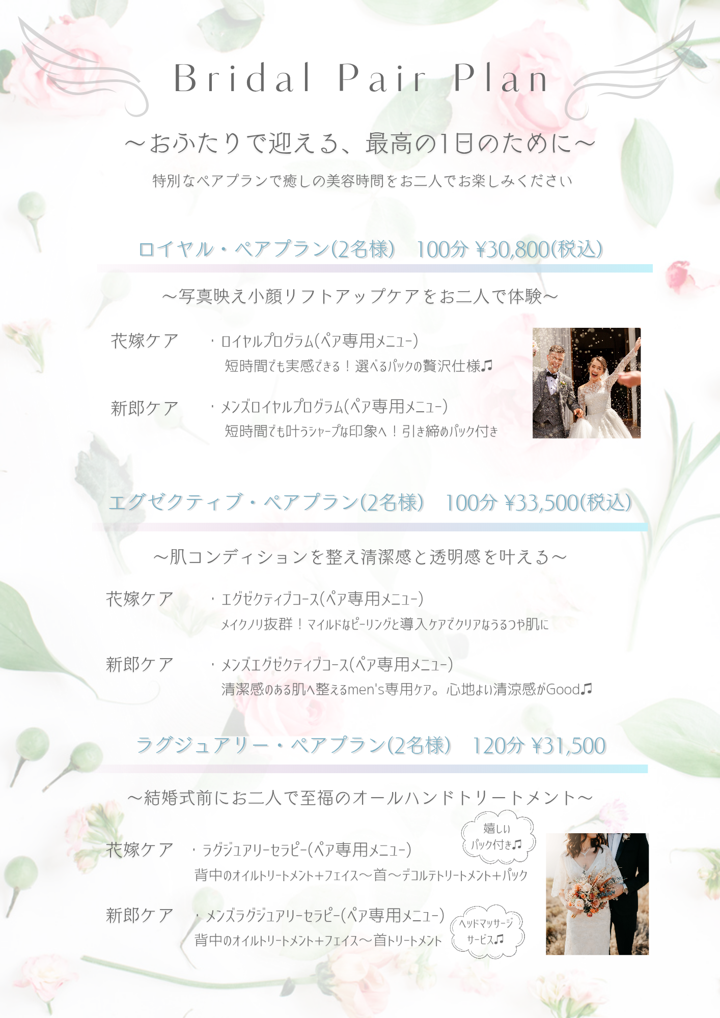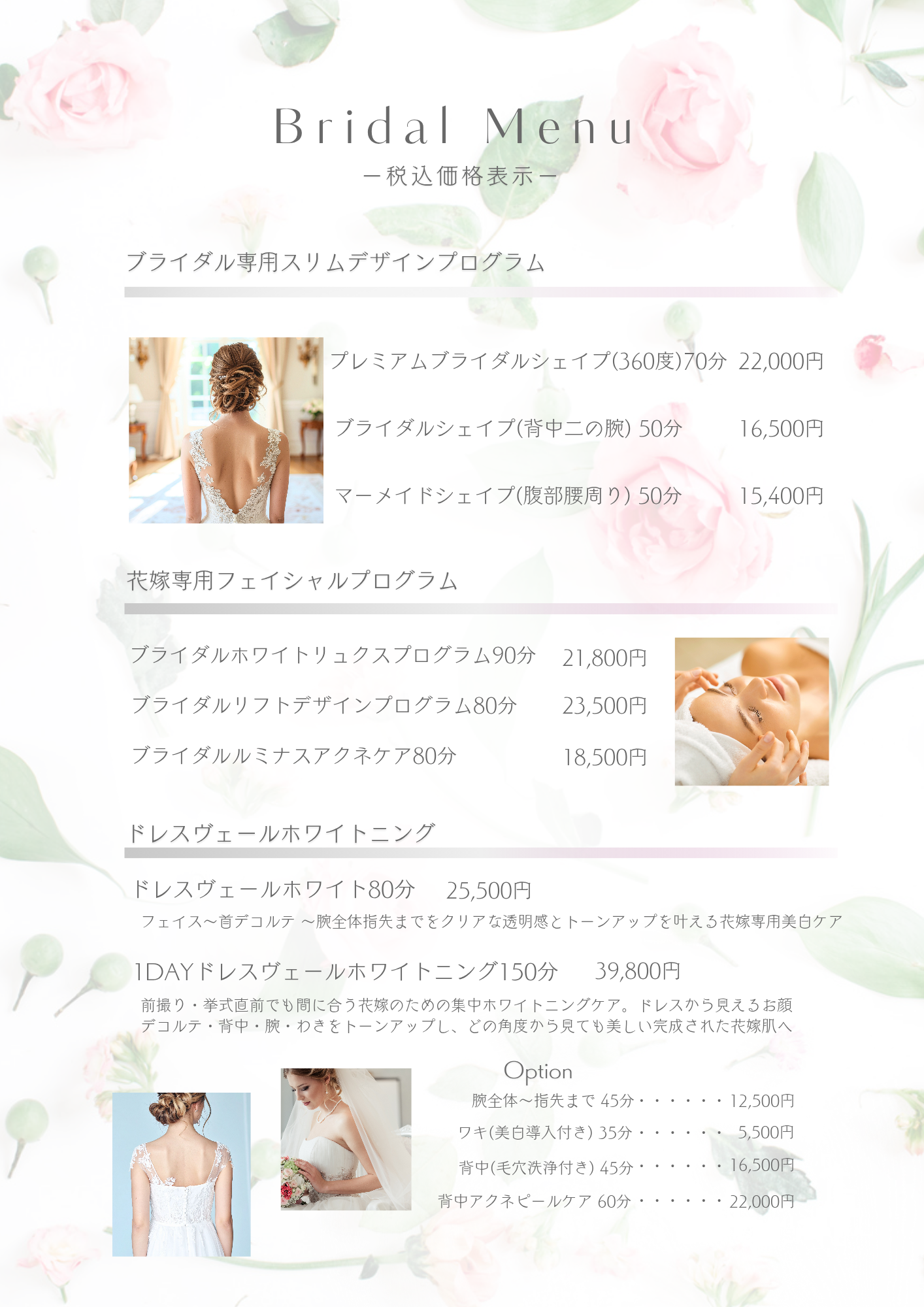 ブライダル専門エステ、お悩みに合わせたフェイシャル、部分痩せ、リンパトリートメントなど
